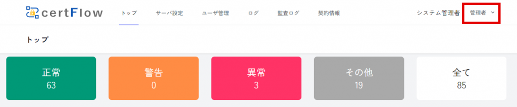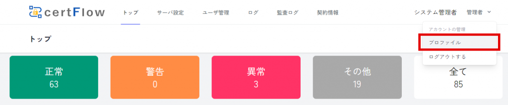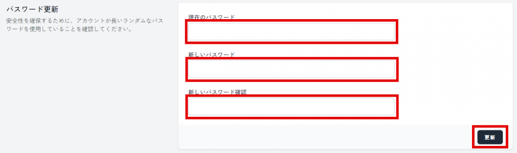 ユーザのパスワード変更 1.プロファイルの表示 上部メニューより、ユーザ名をクリックします。表示されたプルダウンメニューより「プロファイル」をクリックします。 ↓ 2.パスワードの変更 「パスワード更新」の項目までスクロールし、「現在のパスワード」「新しいパスワード」「新しいパスワード確認」をそれぞれ入力します。「パスワード更新」の項目内にある「更新」をクリックします。